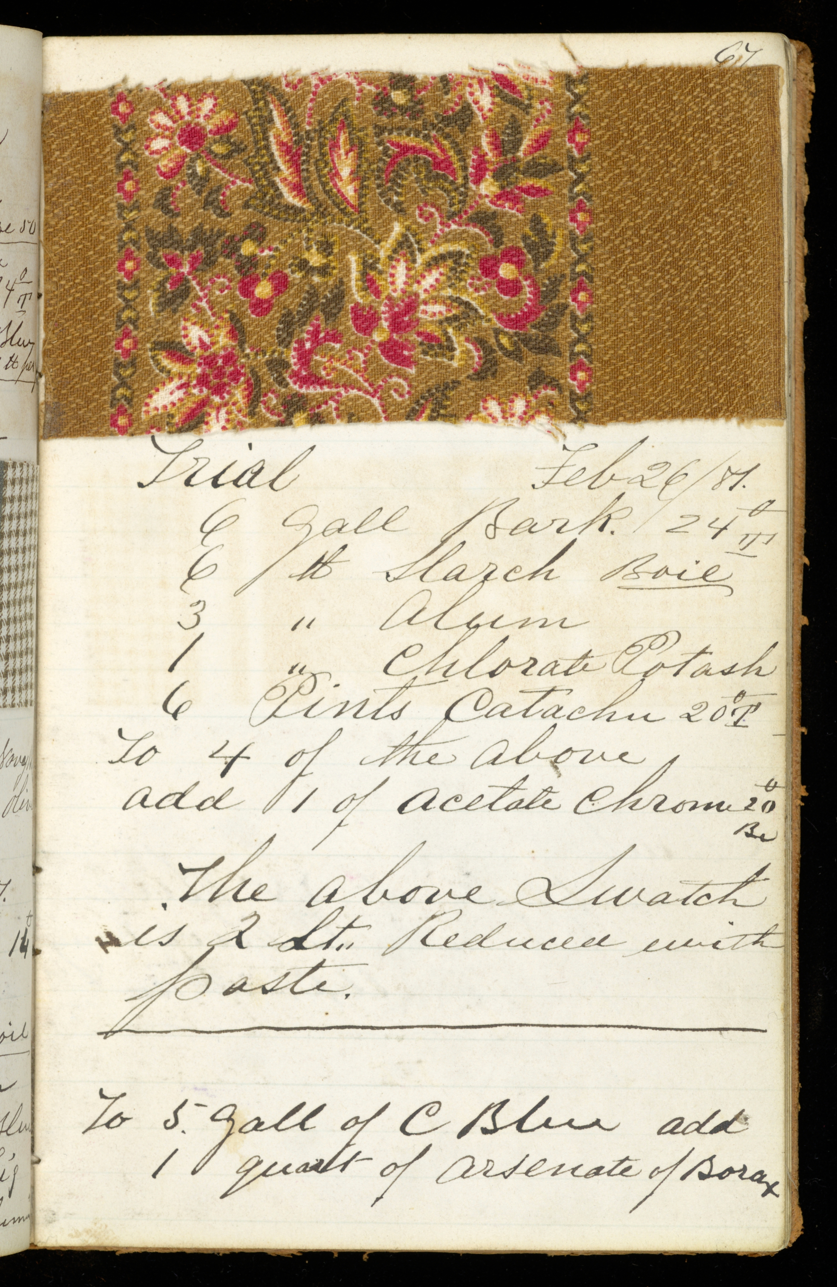 This is a Printer's sample book. It was manufactured by Old Pacific Print Works. It is dated 1879–80 and we acquired it in 1945. Its medium is leather, paper, cotton. It is a part of the Textiles department.
