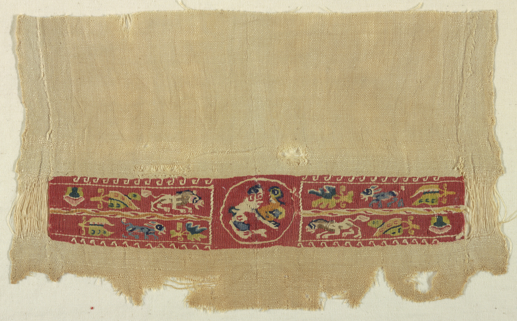 This is a Fragment. It is dated 5th–6th century and we acquired it in 1948. Its medium is linen, wool and its technique is tapestry. It is a part of the Textiles department.
