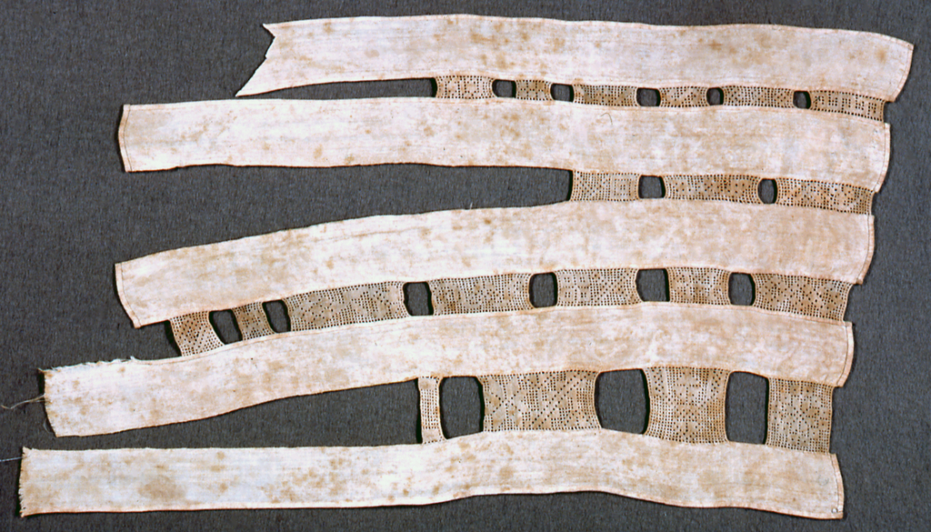 This is a Sampler. It is dated late 19th century and we acquired it in 1981. Its medium is cotton embroidery on cotton foundation and its technique is needle lace insertion in plain weave foundation. It is a part of the Textiles department.