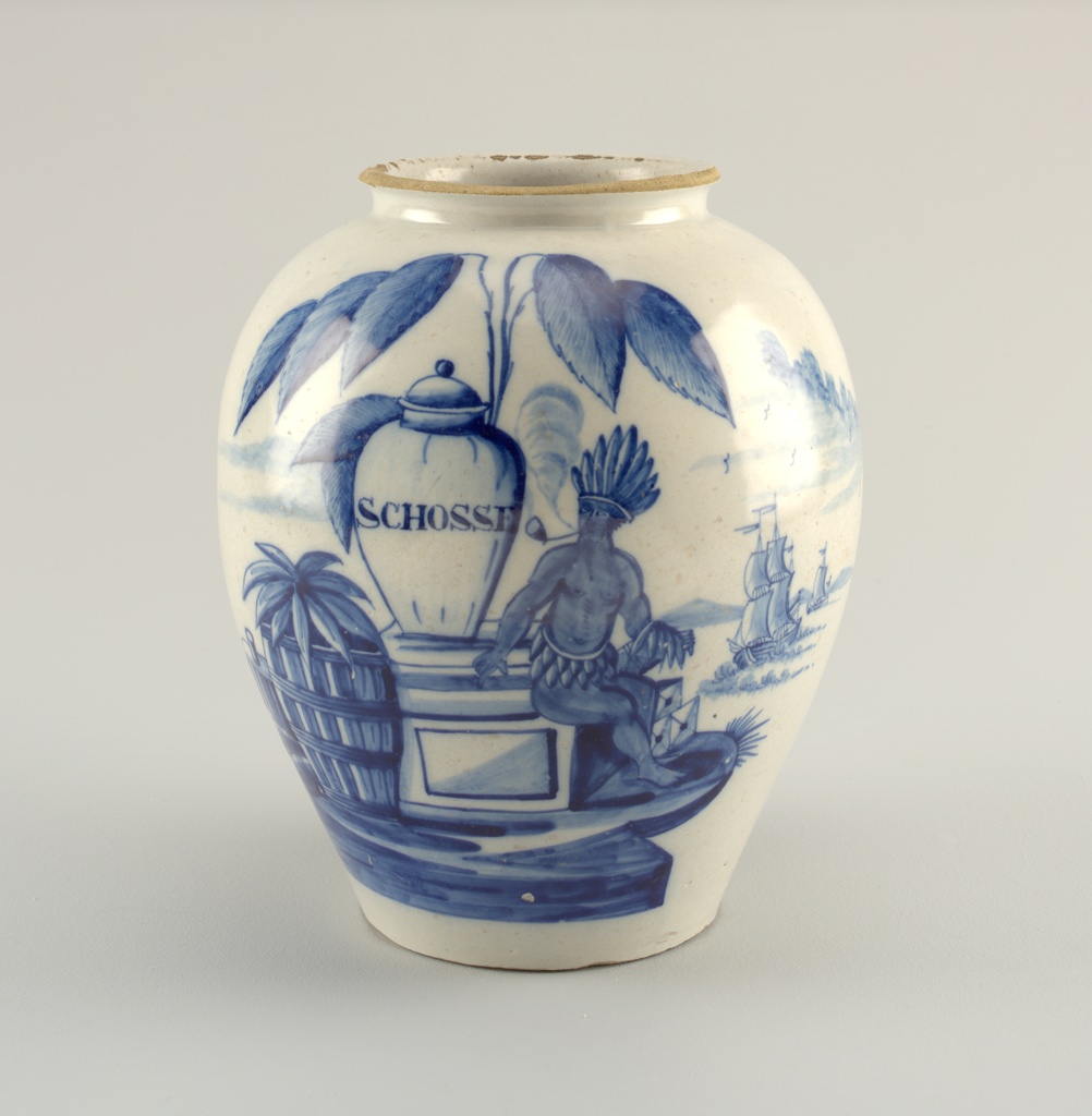 This is a Jar. It was manufactured by Vergulde Bloempot [de] (the Golden Flowerpot). It is dated ca. 1735–65 and we acquired it in 1986. Its medium is tin-glazed earthenware. It is a part of the Product Design and Decorative Arts department.