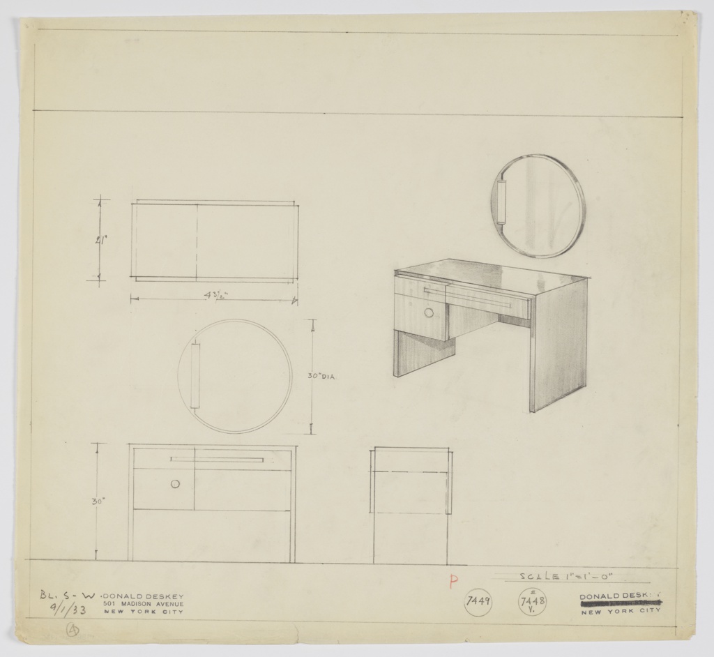 This is a Drawing. It was from the office of Donald Deskey Associates and Donald Deskey and manufactured by BL-S-W. It is dated September 1, 1933 and we acquired it in 1988. Its medium is graphite on tracing paper. It is a part of the Drawings, Prints, and Graphic Design department.