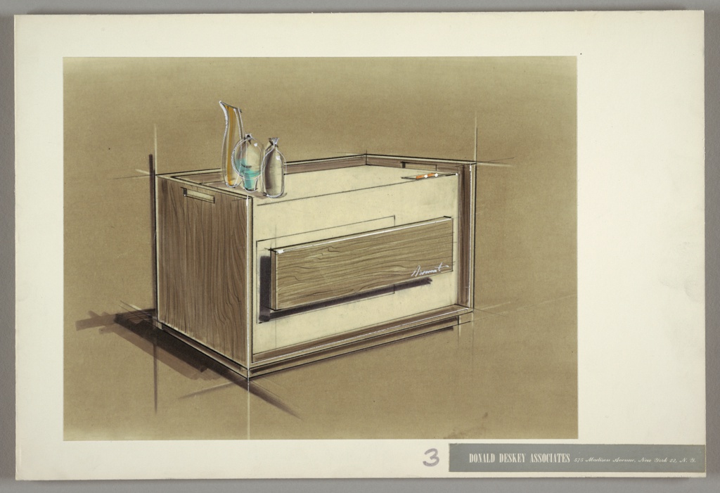 This is a Drawing. It was invented by Alvan Barach and William B. Hall and from the office of Donald Deskey Associates. It is dated 1960–1965 and we acquired it in 1988. Its medium is marker, graphite, rubbed graphite, white heightening, orange crayon on beige board mounted on white board. It is a part of the Drawings, Prints, and Graphic Design department.