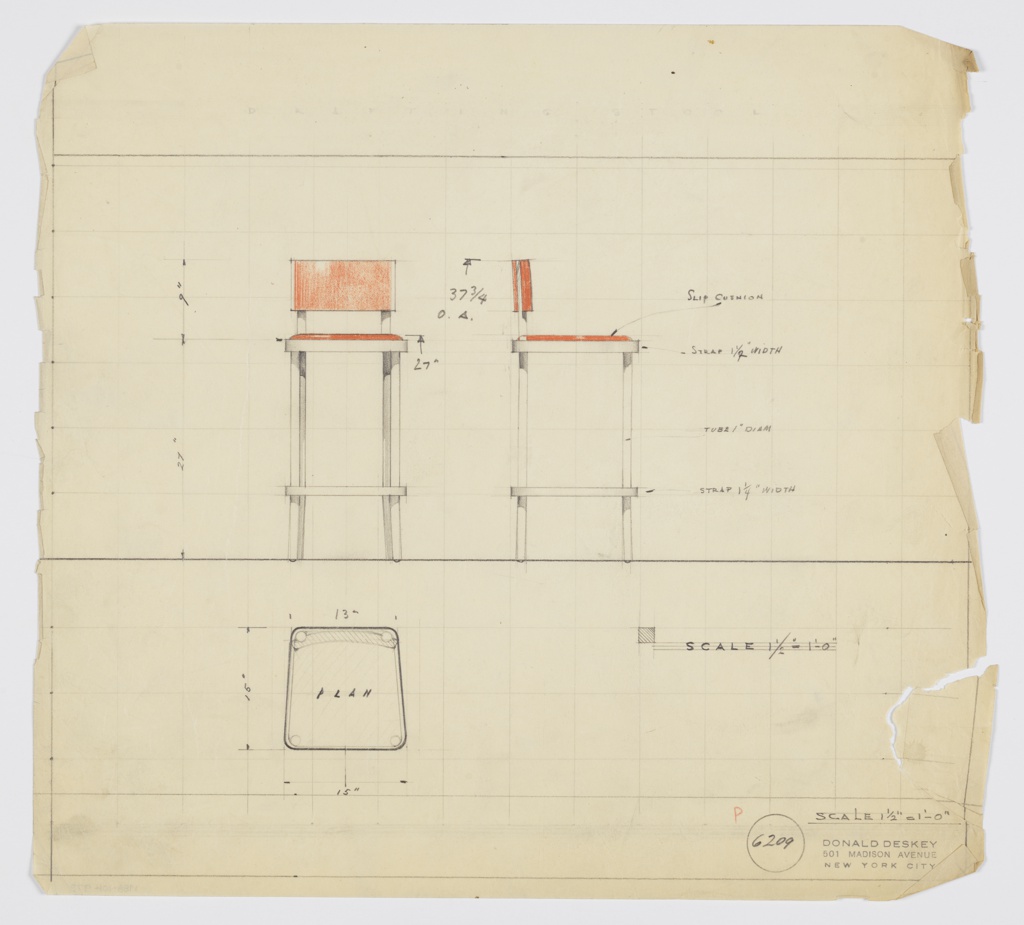 Drawing, Drafting Stool, Metal; Office of Donald Deskey (American, 1894–1989); USA; graphite, red color pencil on tracing paper; 33.7 x 36.8 cm (13 1/4 x 14 1/2 in.); Gift of Donald Deskey; 1988-101-973