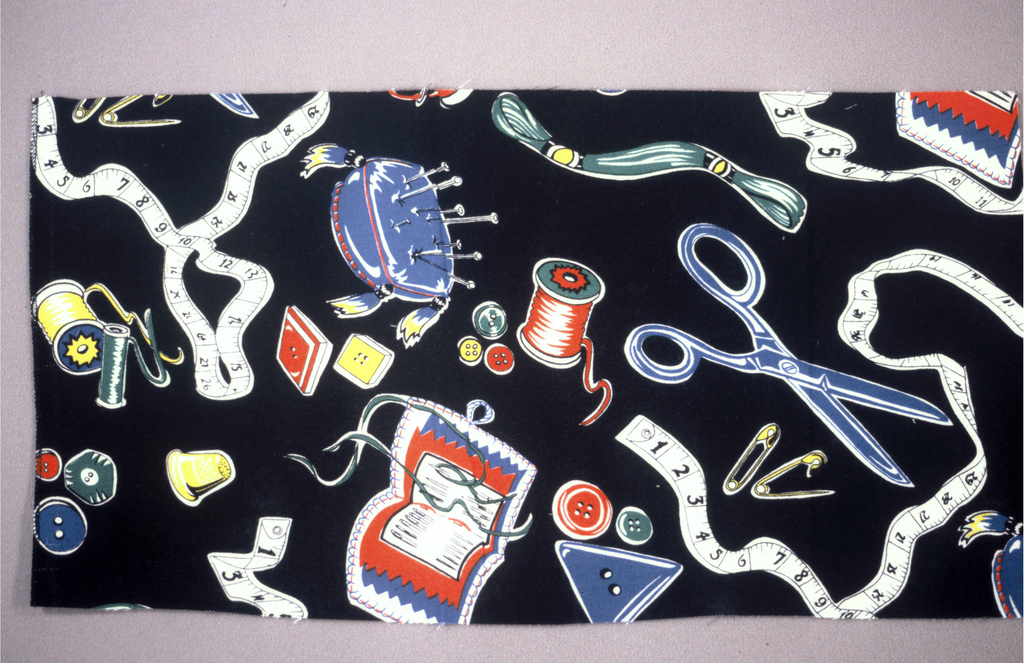 This is a Sample. It was designed by Charlotte Barnes and company: Miss Mouse. It is dated 1973 and we acquired it in 1991. Its medium is synthetic and its technique is roller printed on 2 and 2 twill woven fabric. It is a part of the Textiles department.