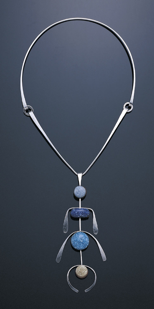 This is a necklace. It was made by Elsa Freund. It is dated 1955–65 and we acquired it in 1991. Its medium is aluminum or silver, ceramic, glass, cord. It is a part of the Product Design and Decorative Arts department.