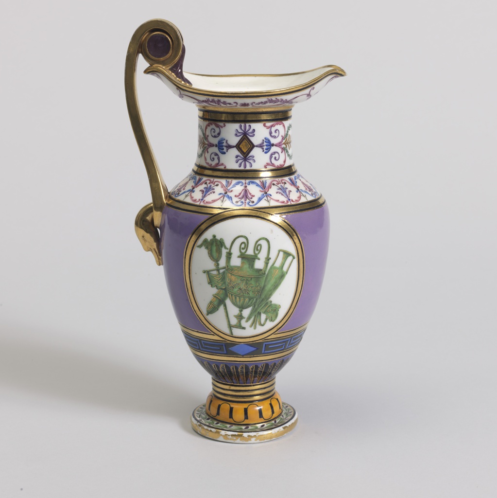 This is a ewer. It was manufactured by Sèvres Porcelain Manufactory. It is dated ca. 1800 and we acquired it in 1991. Its medium is porcelain (possibly soft paste), vitreous enamel, gold. It is a part of the Product Design and Decorative Arts department.