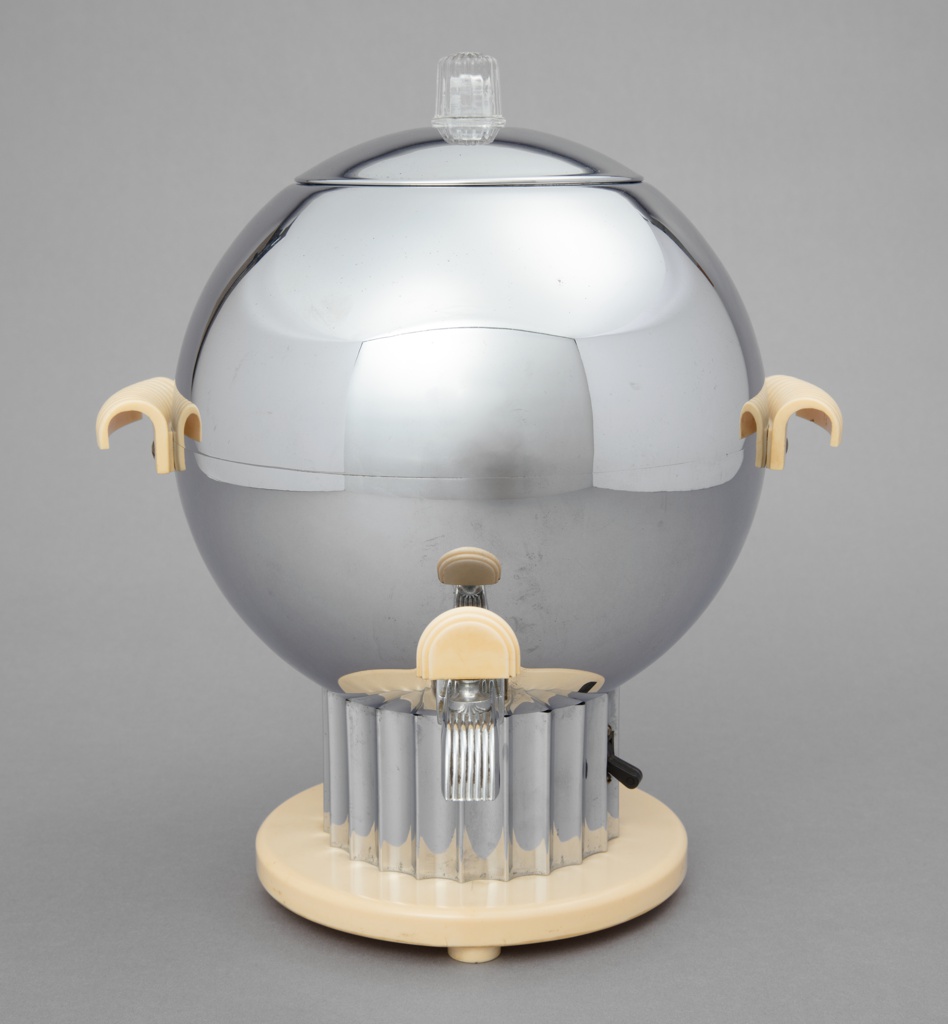 Coronet Coffee Maker; Designed by Walter von Nessen (American, 1889 - 1943); Manufactured by Chase Brass & Copper Co. (United States); USA; chrome-plated metal, plastic; H x W x D: 30 x 27 x 25.5 cm (11 13/16 x 10 5/8 x 10 1/16 in.); Gift of Mel Byars; 1991-59-87-a/c