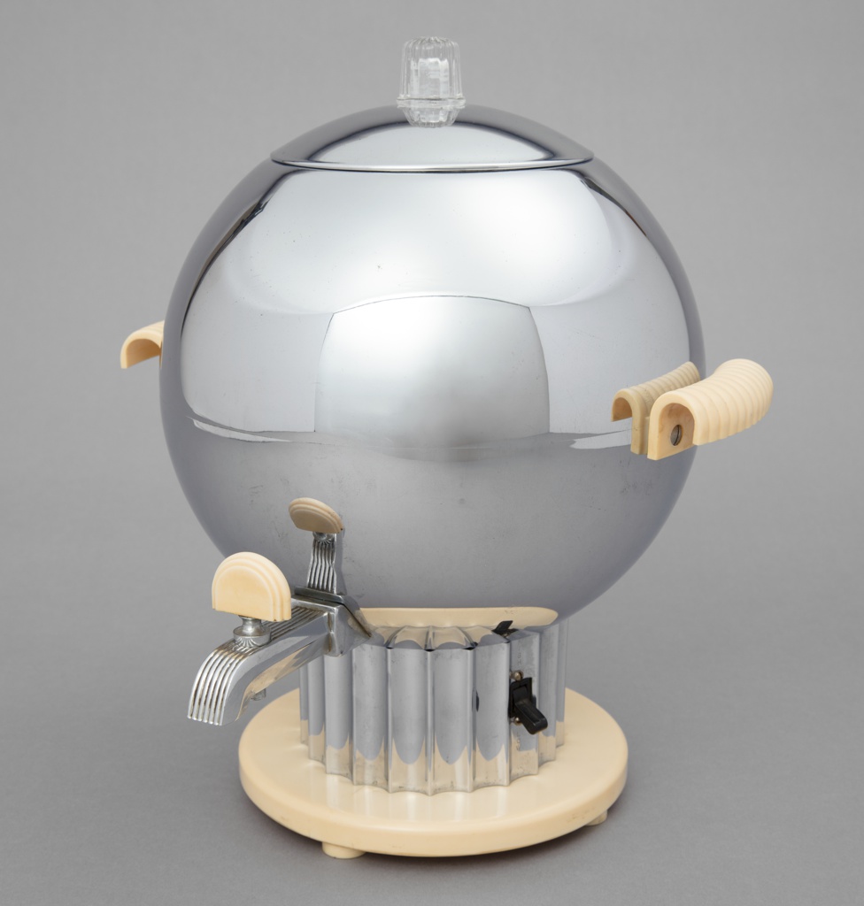 This is a coffee maker. It was designed by Walter von Nessen and manufactured by Chase Brass & Copper Co.. It is dated 1938–1942 and we acquired it in 1991. Its medium is chrome-plated metal, plastic. It is a part of the Product Design and Decorative Arts department.