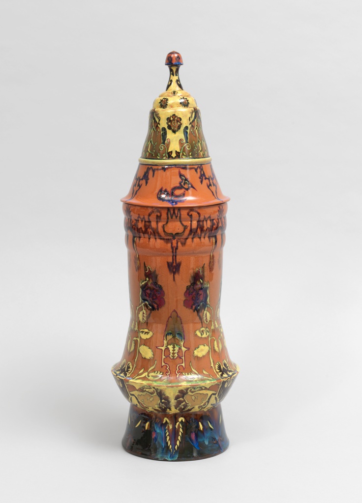 Covered Vase Vase; Designed by Theodorus Adriaan Christiaan Colenbrander (Dutch, 1841 – 1930); Manufactured by Rozenburg Pottery and Porcelain Factory (Netherlands); Netherlands; earthenware; H x diam. (overall): 61 × 20.2 cm (24 in. × 7 15/16 in.); Gift of Justin G. Schiller; 1992-100-2-a,b