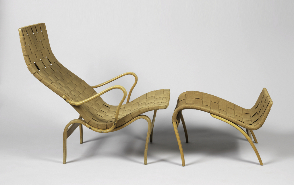 Pernilla Lounge Chair, Ottoman And Cushion; Designed by Bruno Mathsson (Swedish, 1907 - 1988), Elsa Gullberg (Swedish, 1886–1984), Arthur Percy; Sweden; bent birch, webbing (bast), woven cotton; H x W x D (chair): 92.1 × 64.8 × 99.1 cm (36 1/4 in. × 25 1/2 in. × 39 in.) H x W x D (ottoman): 41.9 × 50.8 × 65.4 cm (16 1/2 in. × 20 in. × 25 3/4 in.) H x W x D (cushion): 13 × 53.5 × 25.6 cm (5 1/8 × 21 1/16 × 10 1/16 in.); Gift of Dr. David V. Becker; 1992-177-1-a/c