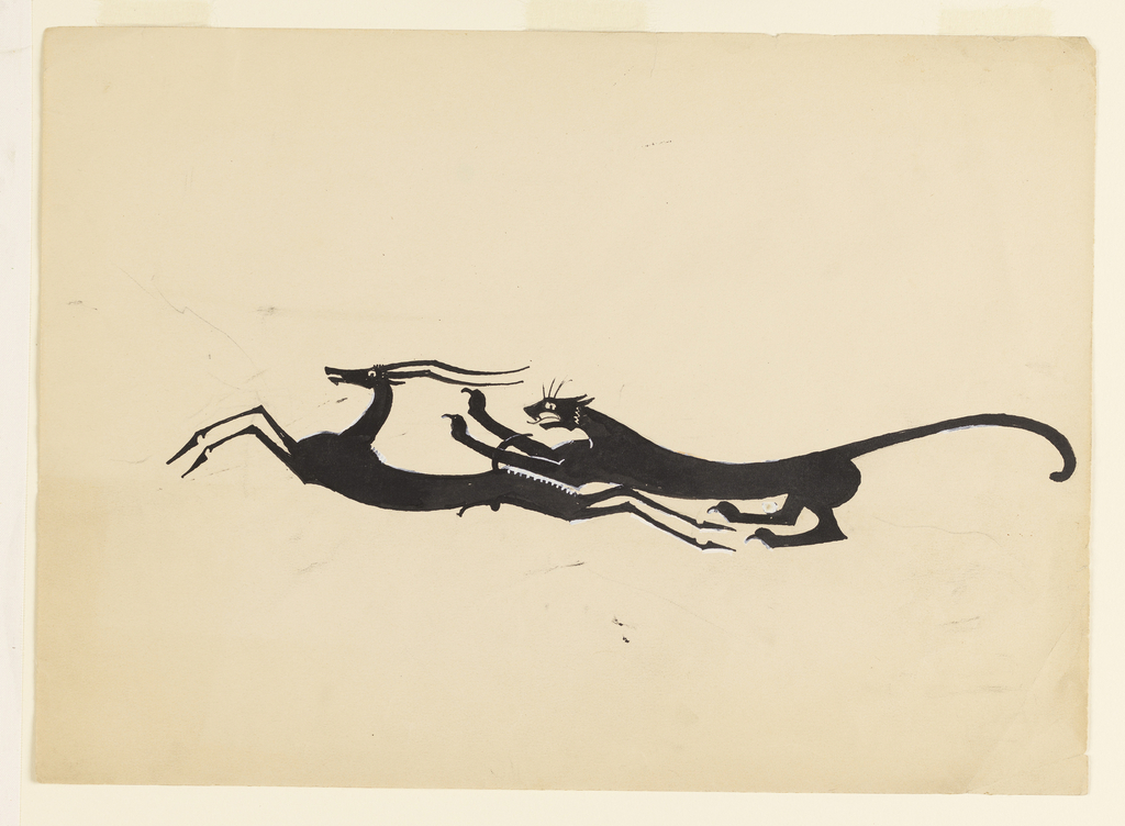 Drawing, Leopard Chasing a Gazelle; Designed by William Hunt Diederich (American, b. Hungary, 1884–1953); brush and black ink, white gouache on light brown paper; 25.2 x 35 cm (9 15/16 x 13 3/4 in.); Gift of Diana Diederich Blake; 1992-92-34