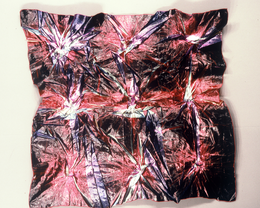 This is a Scarf. It was designed by Junichi Arai. It is dated 1993 and we acquired it in 1993. Its medium is warp: metallic film; weft: polyester and its technique is tied-resist dyeing (shibori) on plain weave with pleating and transfer printing. It is a part of the Textiles department.