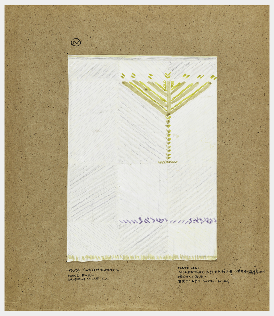 Inscribed in brush and purple watercolor, lower third of drawing, center right: Yisrael [twice, in Hebrew characters]; in pen and black ink, on mount, beneath right corner of drawing: MATERIAL/SILVERTHREAD (sic) + WHITE / MERO / COTTON / TECHNIQUE: / BROCADE WITH INLAY; on mount, above upper left corner of drawing: IV [encircled]