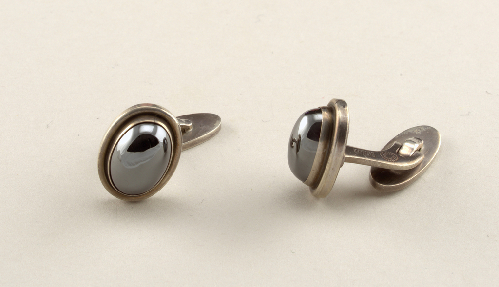 This is a cufflink. It was manufactured by Georg Jensen Sølvsmedie. It is dated ca. 1945 and we acquired it in 1994. Its medium is silver, hematite. It is a part of the Product Design and Decorative Arts department.