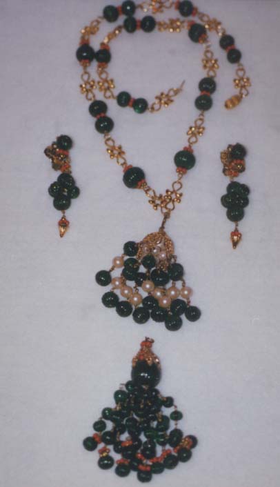 - gold, green colored stones, coral.
