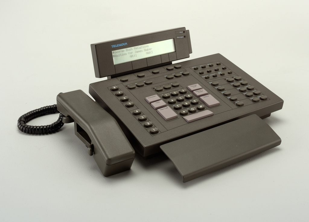 Telenova Basic Operator's Station Set Cord; Designed by Martin Darbyshire, ID Two; Manufactured by Telenova, Inc.; USA; metal housing; Overall: 14.9 x 38.5 x 34.1 cm (5 7/8 x 15 3/16 x 13 7/16 in.); Gift of Arango Design Foundation; 1994-31-124-a/c