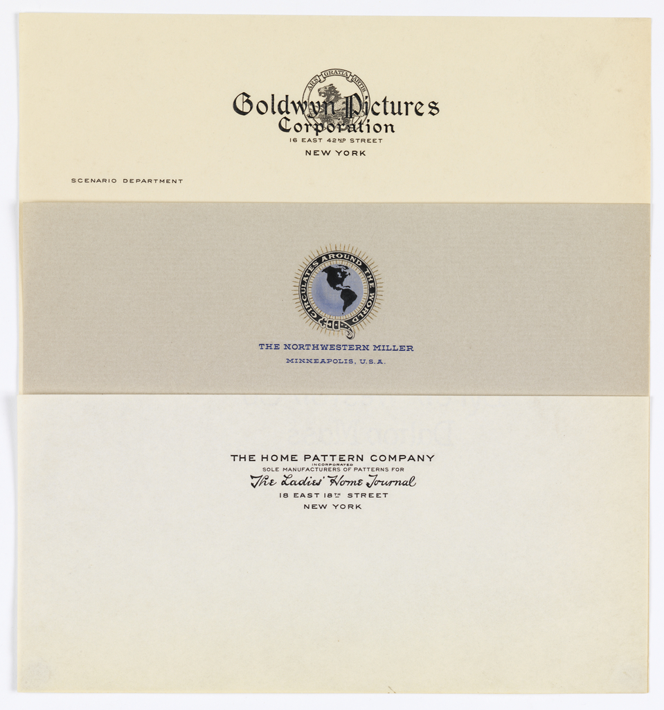 Printed in black ink, center: Arts Gratia Artis. Superimposed and centered over seal: Goldwyn Picture/ Corporation/ 16 East 42nd Street/New York. Below on left: Scenario Department. Printed in blue ink, center: The Northwestern Miller/ Minneapolis, U.S.A; printed in black ink, in belt: circulates around the world. Printed in black ink, upper center: The Home Pattern Company/ Incorporated/ Sole Manufacturers of Patterns for/ The Ladies' Home Journal/ 18 East 18th Street/ New York.