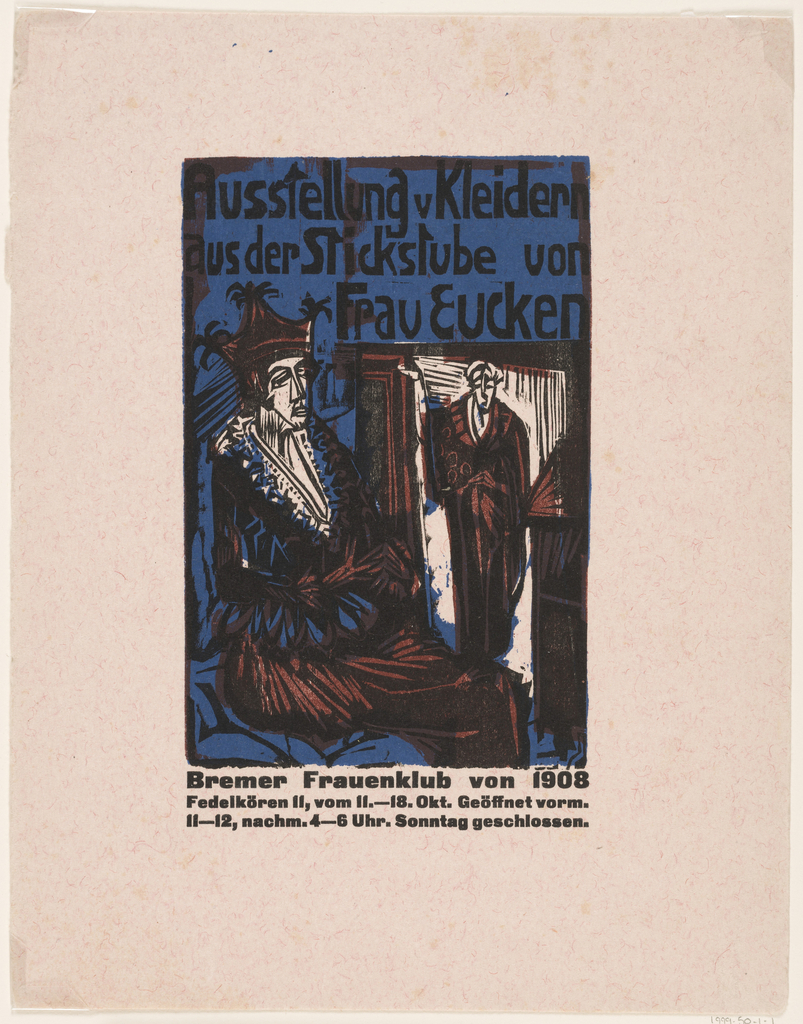 Booklet Cover Sheet, Katalog der Ausstellung von Kleidern aus der Stickstube von Frau Eucken, Bremen... [Catalogue for Exhibition of Clothing from Mrs. Eucken's Embroidery Studio, Bremen]; Print Maker: Ernst Ludwig Kirchner (German, 1880 – 1938); color woodcut on lavender wove paper; Cover sheet: 28.0 x 43.8 cm (11 x 17 1/4 in. ) Inner sheet: 28.0 x 44.1 cm (11 x 17 3/8 in.); Museum purchase from Drawings and Prints Council Fund and through gift of Margery and Edgar Masinter and Merrill C. Berman; 1999-50-1-1