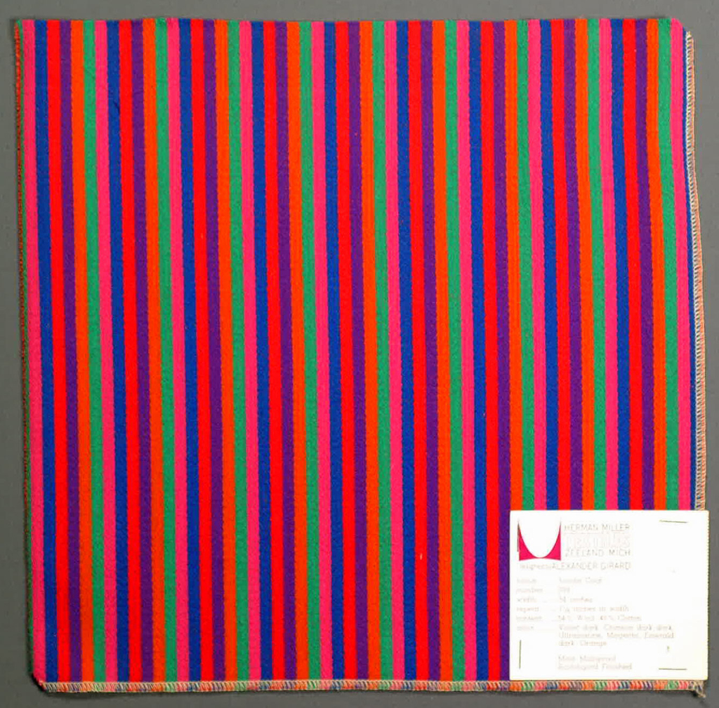 This is a Sample. It was designed by Alexander Hayden Girard and produced by Herman Miller Furniture Company. It is dated 1955 and we acquired it in 1969. Its medium is wool (54%) and cotton (46%) and its technique is warp-faced twill. It is a part of the Textiles department.