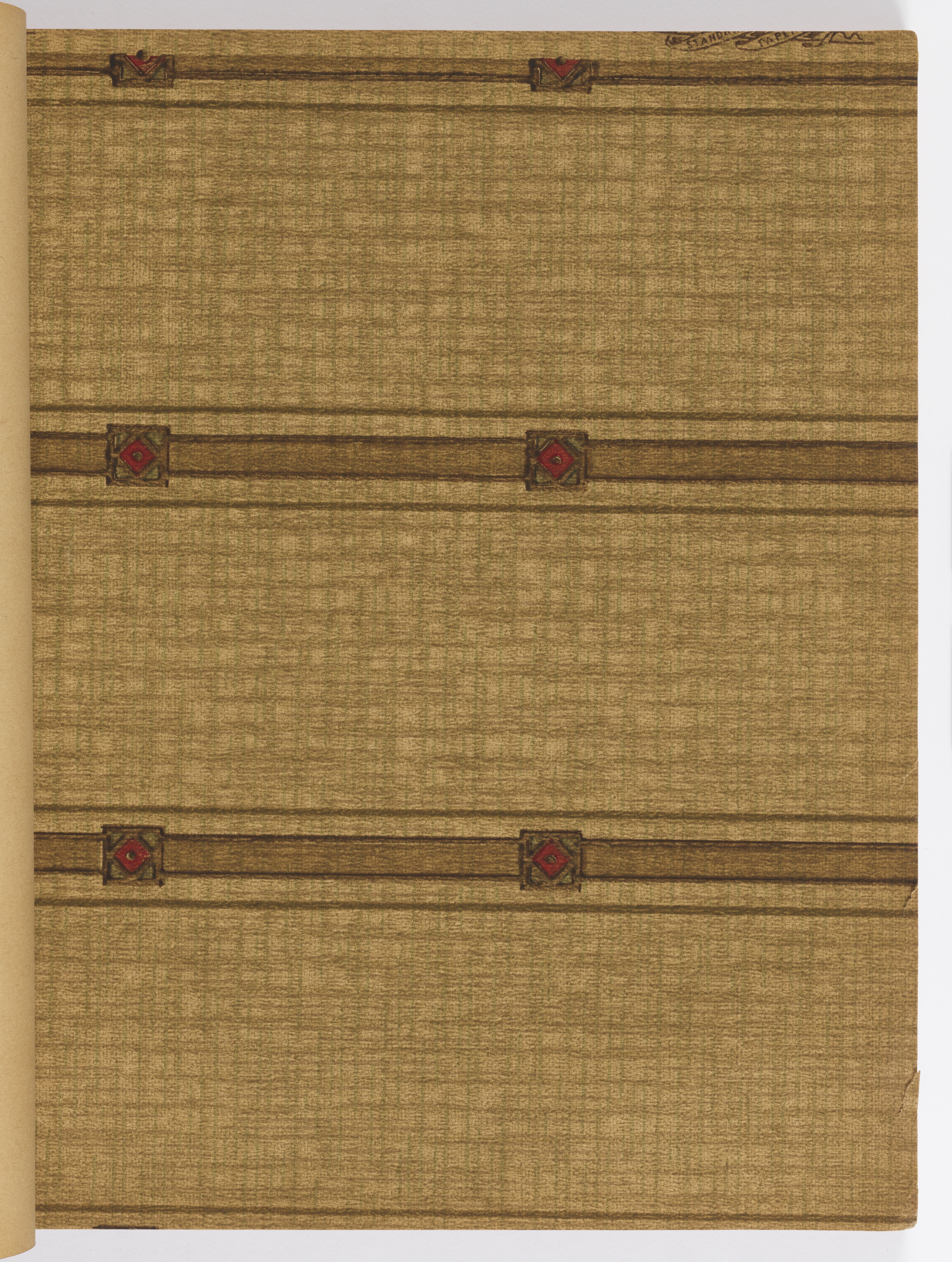 This is a Sample book. It was manufactured by York Card & Paper Co., Standard Wall-Paper Company and Becker, Smith & Page, Inc. and distributed by Alfred Peats Company. It is dated 1915 and we acquired it in 2002. Its medium is machine-printed paper, intaglio printed, oatmeal paper. It is a part of the Wallcoverings department.
