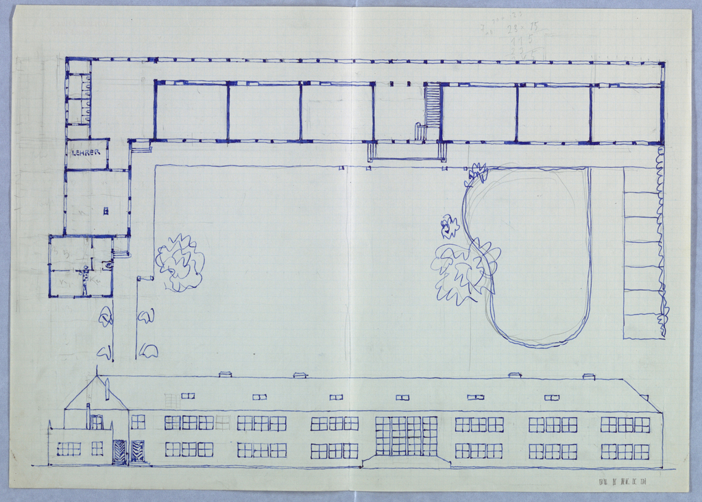 Drawing, Volksschule Stockerau (Stockerau Primary School - Floor Plan, Garden, and Front Façade Elevation); Architect: Josef Hoffmann (Austrian, b. Moravia, 1870–1956); Austria; pen and blue ink, graphite on graph paper; verso: red pencil; 29.7 x 41.9 cm (11 11/16 x 16 1/2 in.); Gift of Marilyn Walter Grounds; 2008-20-23