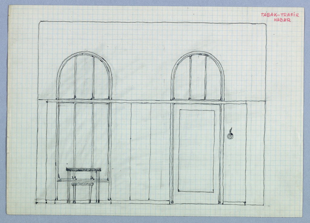 Drawing, Tabak-Trafik Naber [Tobaccanist's Shop (Wall Elevation with Window, Door, Table and Stool)]