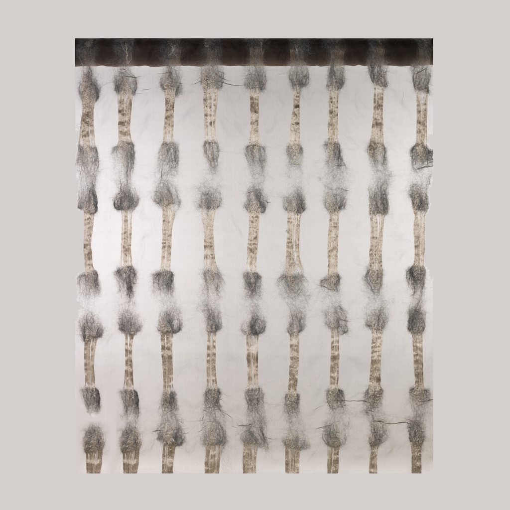 SI Alpaca reflects Jongstra’s interest in combining sheerness and opacity, a challenge she began pursuing in a commission from Triodos Bank in Zeist, the Netherlands (2008–10). Her exploration has resulted in experimentation with what is commonly called nuno felting, or felting through a woven substrate. SI Alpaca exemplifies this technique and provides an interesting technical comparison to float-pattern weaving, which the museum’s collection has in abundance. The piece also relates to some of Cooper-Hewitt’s contemporary Japanese textiles, in which the control of floating weft elements is produced through heat treating or chemical means.