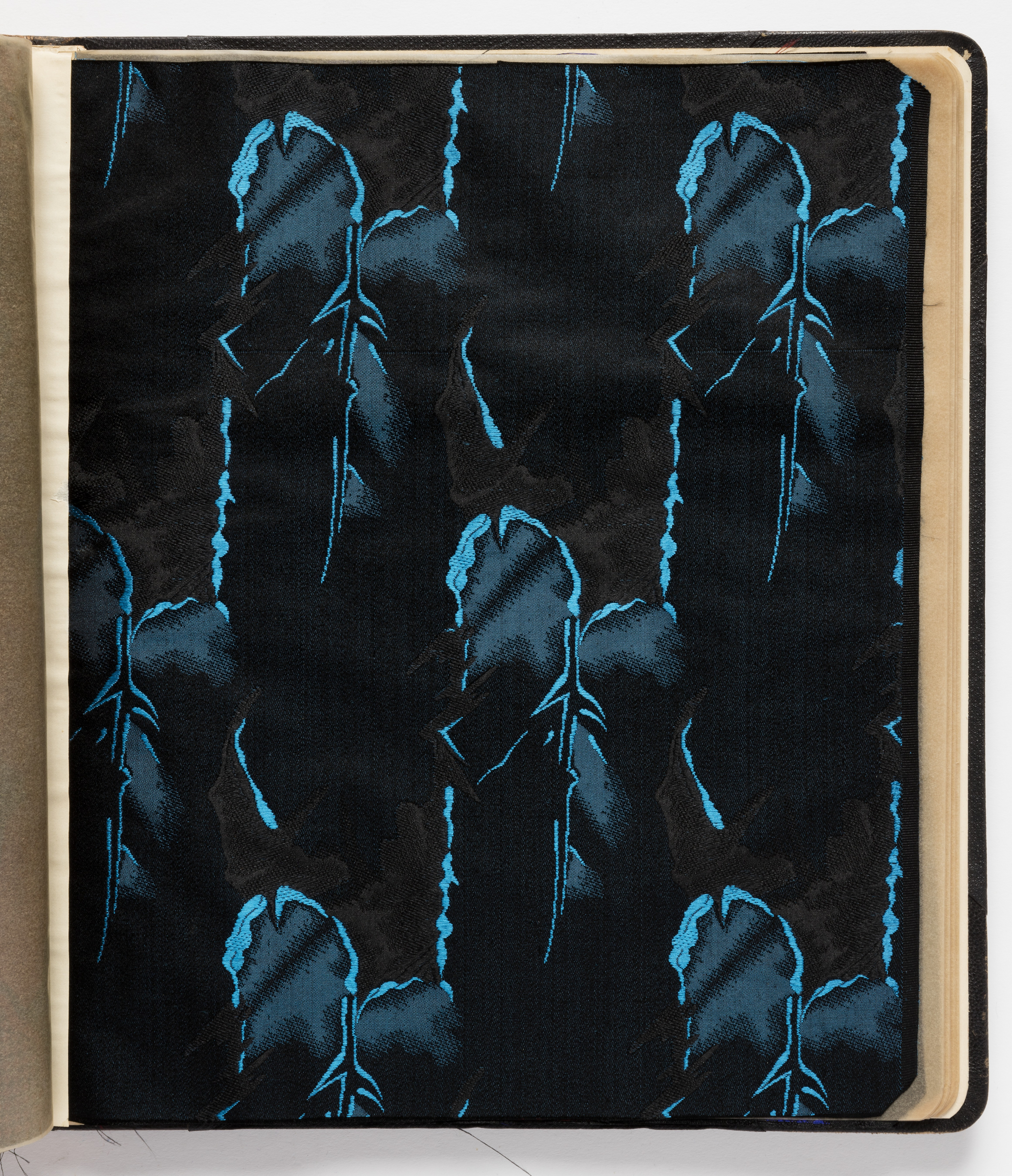 This volume features black silks woven in elaborate patterns that are enhanced by vivid shades of red, blue, turquoise, and purple. These samples may have been used for men's waistcoats, smoking jackets, and as linings for coats; black was the mainstay of men’s fashion in the 19th century. These fabrics would have offered a touch of luxury and color in otherwise somber attire.