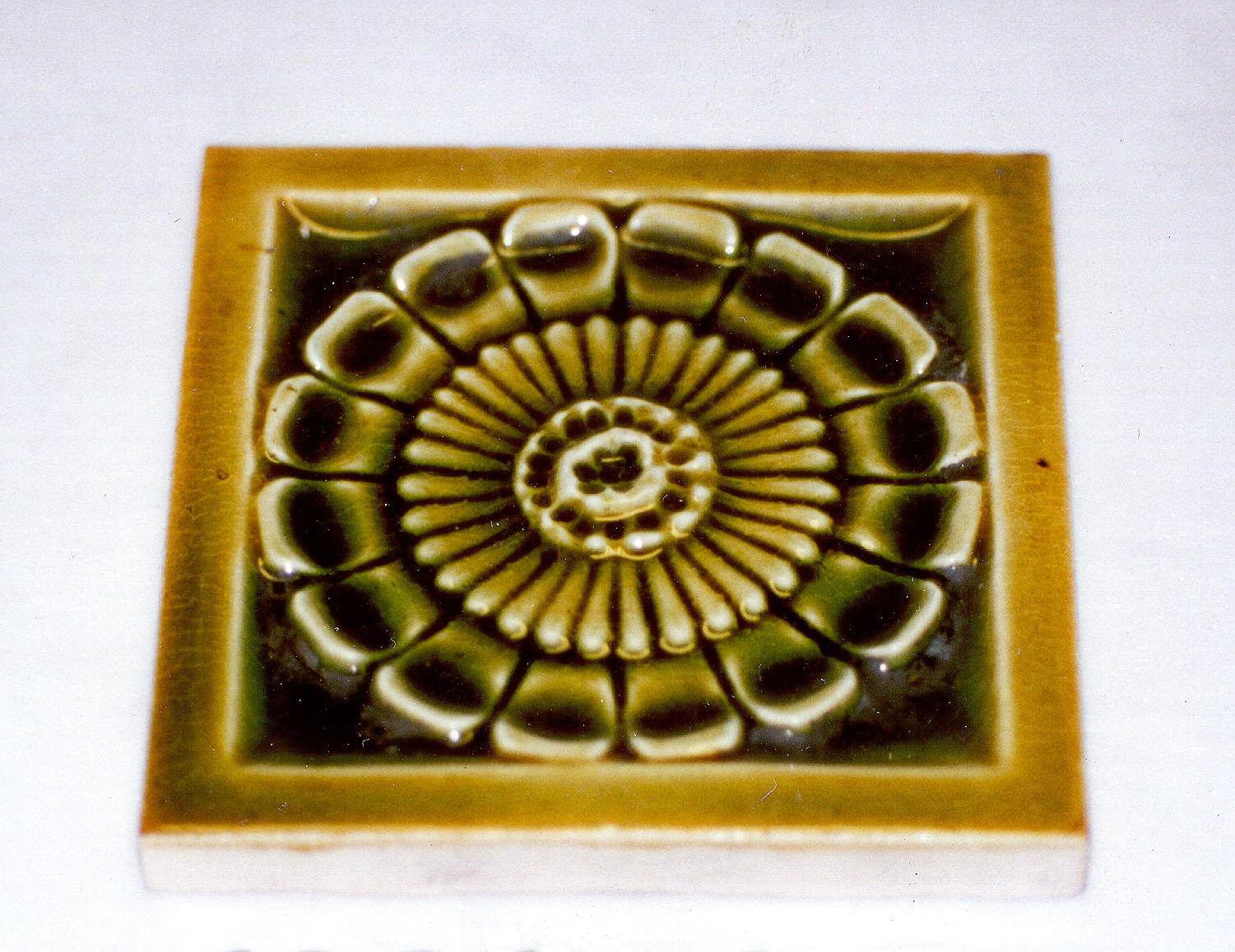 Tile (USA); Manufactured by J. & J. G. Low Art Tile Works; glazed stoneware; 10.8 x 10.8 x 1.1 cm (4 1/4 x 4 1/4 x 7/16 in. ); Gift of Florence Barnes; 1981-56-44
