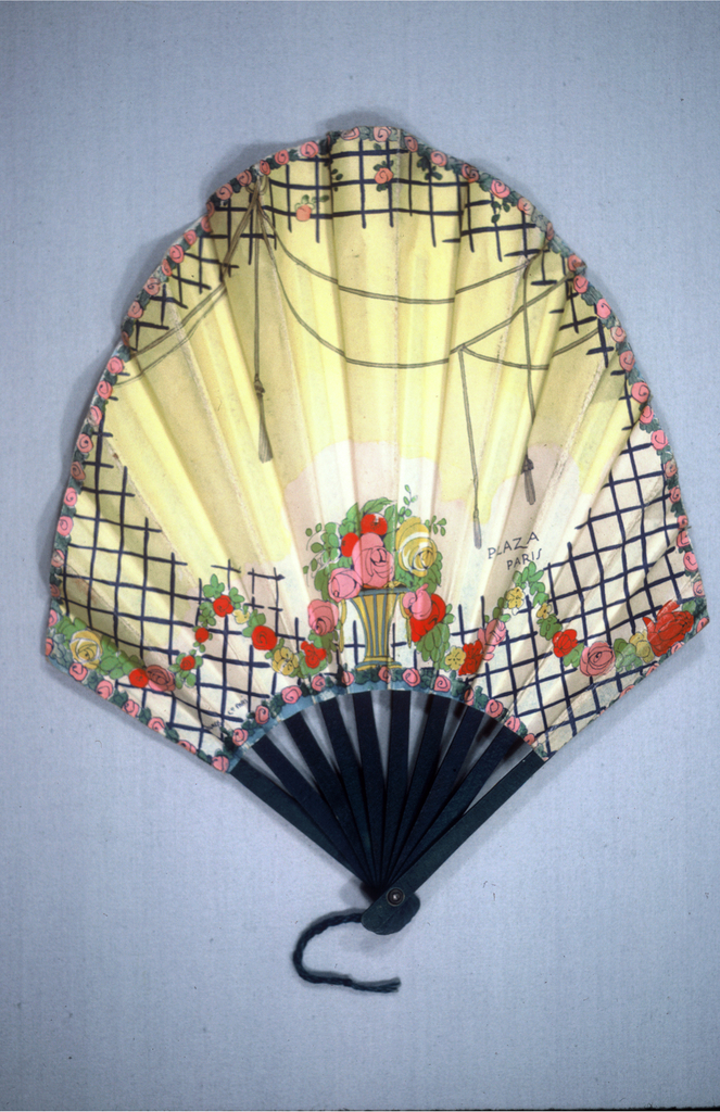 This is a Pleated fan. It is dated 1920–1929 and we acquired it in 1983. Its medium is printed paper leaf, painted wood sticks, metal bail. It is a part of the Textiles department.