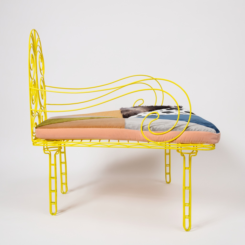 This is a chair. It was created by Tschabalala Self and with contribution from Montgomery Harris and Isa Rodrigues and fabricated by Johnson Trading Gallery. It is dated 2021 and we acquired it in 2022. Its medium is hand formed and welded steel rods, powder coat finish; custom fabric and dacron. It is a part of the Product Design and Decorative Arts department.