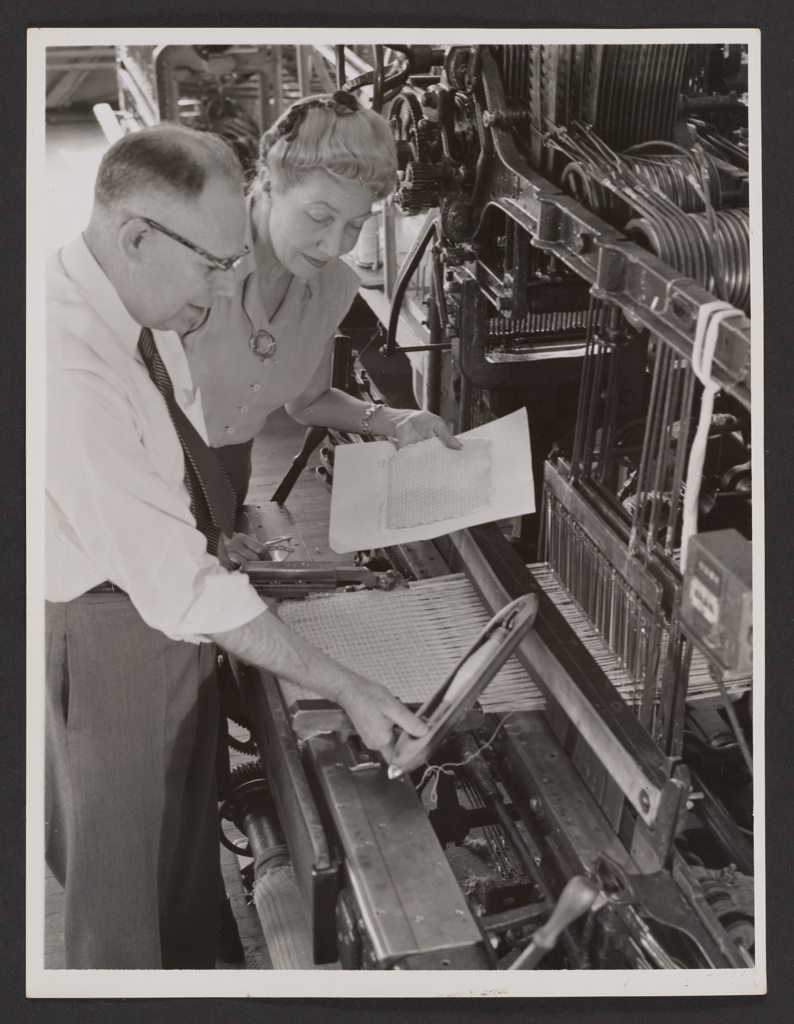 Photograph, Dorothy Liebes with Ernst Spence at Goodall Fabrics, Sanford, Maine