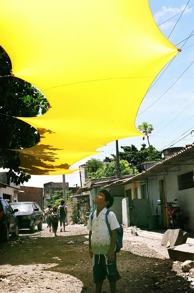 The Inclusive Edge canopy creates public space for the favela community of Pilar in Recife, Brazil, by providing shade at a low cost. Material is stretched over the street and fixed to points on existing trees, roofs, water tanks, poles, and shop fronts. A flexible space emerges under the canopy, where children play in the shade, workers eat lunch, and neighbors gather to converse. The canopy and space underneath engender pride and a sense of community, and the identifiable yellow color of the canopy acts as a neighborhood landmark.