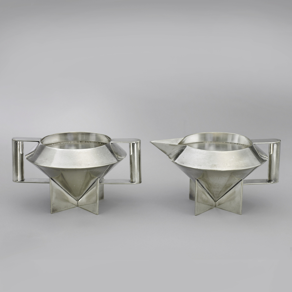 Karasz’ design is also bold in that it could be mechanically reproduced. Indeed, this sugar bowl and creamer set was made by the Paye & Baker Manufacturing Company, who chose to produce this design in electro-plated nickel silver. Electro-plating involves coating a metal object (for example, made of copper), with a thin layer of another metal or alloy – in this case, nickel silver, by dipping it into a solution of the metal or alloy and using electrical forces to have it adhere to the surface of the object.