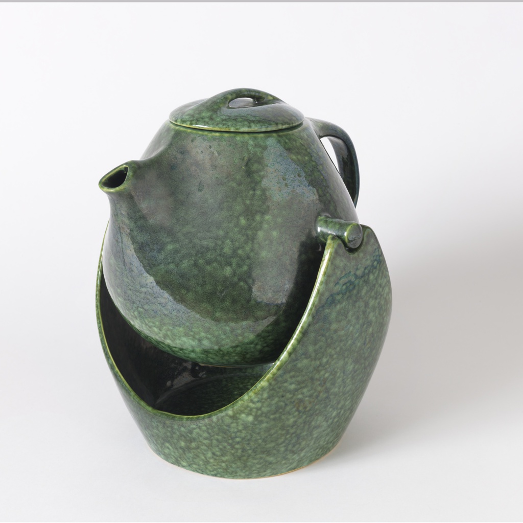 Raymor Coffee Pot, Lid And Stand; Designed by Ben Seibel (American, 1918-1985); Manufactured by Roseville Pottery (United States); Distributed by Raymor; USA; glazed molded stoneware; H x W x D (coffee pot on stand): 31 × 29 × 29 cm (12 3/16 × 11 7/16 × 11 7/16 in.); Gift of Harriet Magrish Bernstein; 2014-49-1-a/c