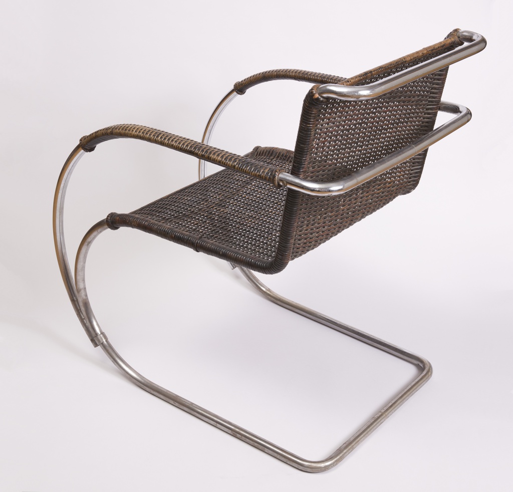 This cantilevered chair was first shown at the Weissenhof exhibition in Stuttgart, Germany in 1927. Its companion chair, the MR10, also debuted at the exhibit and has an identical design silhouette, except that it lacks arms. Mies was assigned to organize the exhibit and in November of 1926, met several designers preparing works for the show. One of them, architect Mart Stam, had been working on a concept for a cantilevered chair that did away with a chair’s traditional four legs, and instead used gas piping that was screwed together with angle fittings into one continuous piece. Mies was intrigued with the idea, but hated the cumbersome fittings. He re-drew the chair as a series of curves and specified that it be bent cold to retain the elasticity inherent in the tubular steel. Once the steel was properly shaped, he had it nickel-plated. A cane seat and arms completed this new cantilevered furniture form.