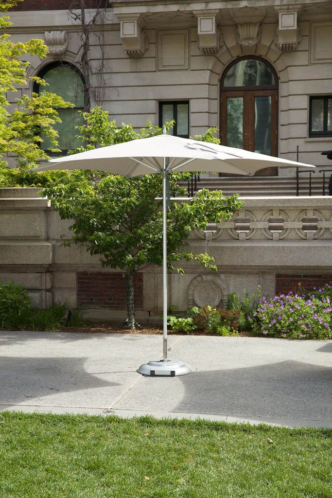 This is a Tuuci® Hexagon Shade and Mobile Stand. It was designed by Dougan Clarke and manufactured by Design Within Reach. It is dated 2000. Its medium is anodized aluminum alloy), stainless steel, 100% solution-dyed acrylic sunbrella® canvas.