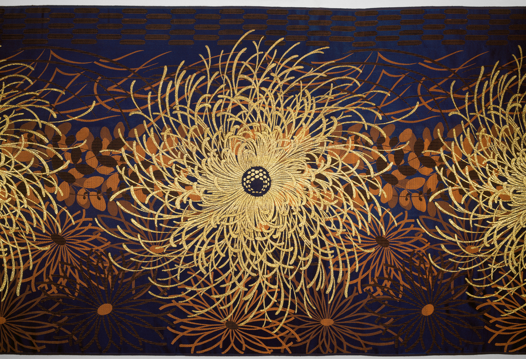 For the 1925 Paris Exposition, Maison Bertrand produced a silk fabric with large-scale embroidered chrysanthemums that resemble tumbling fireworks displays. Among the many sumptuous textiles presented by Maison Bertrand, this was probably intended for use in a coat or shawl.